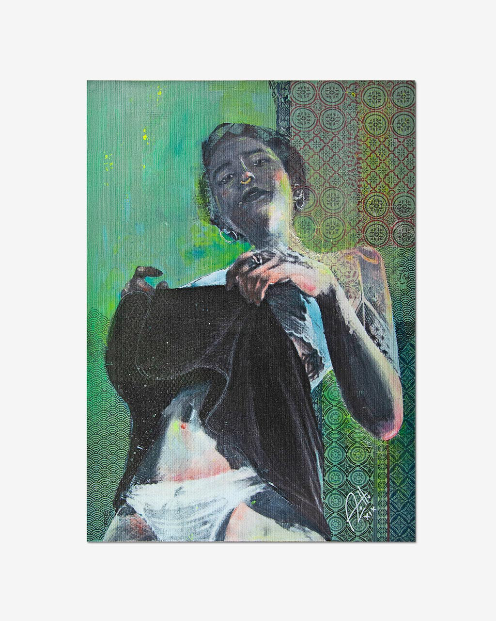 Estetica pop, spirito urbano. Un’opera in tecnica mista su tela non tirata che si distingue per il mix pittorico stratificato. Le vernici acriliche e a solvente creano un effetto di luminosità e profondità, mentre i marker e il collage aggiungono dettagli e movimento.